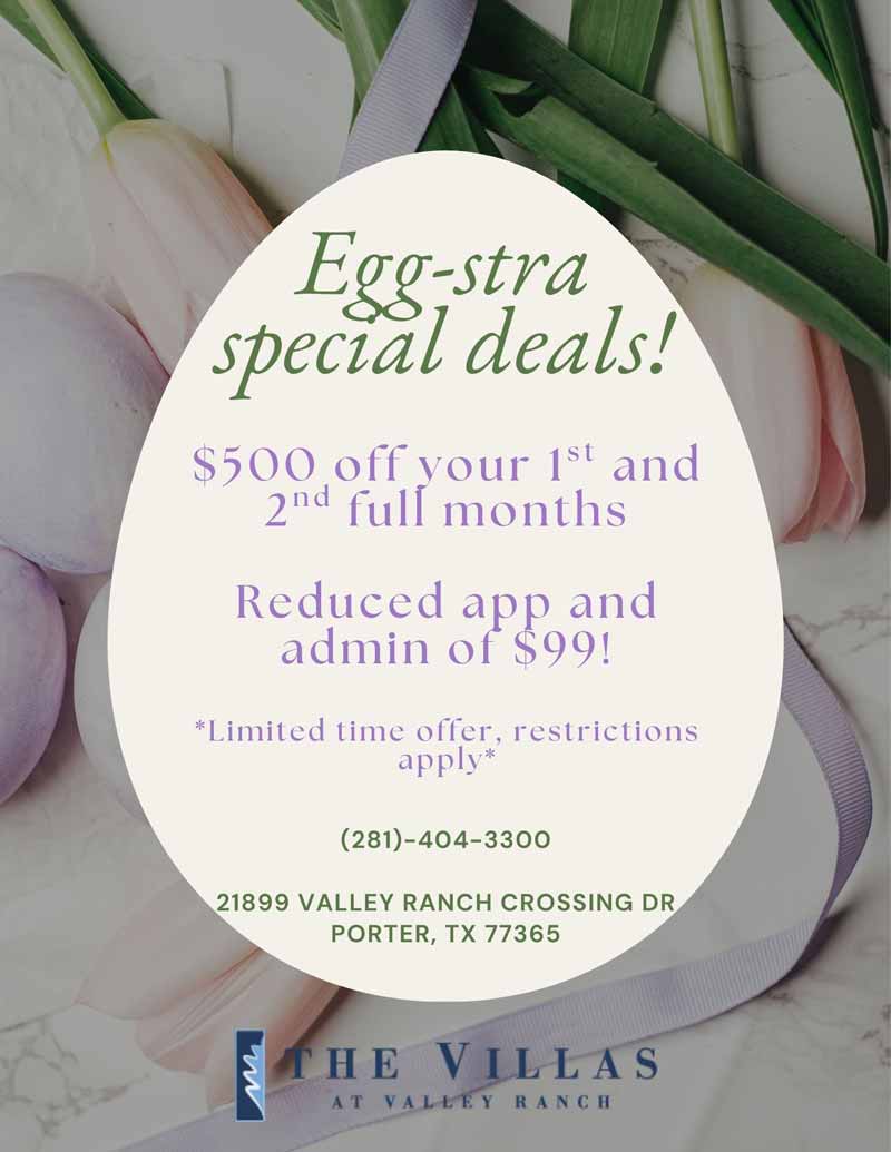 Villas at Valley Ranch is a unique luxury apartment community minutes from Kingwood and part of the greater metroplex of Houston. You’ll enjoy a slower paced lifestyle in acres of scenic countryside combined with plenty of shopping, dining, and entertainment minutes away.