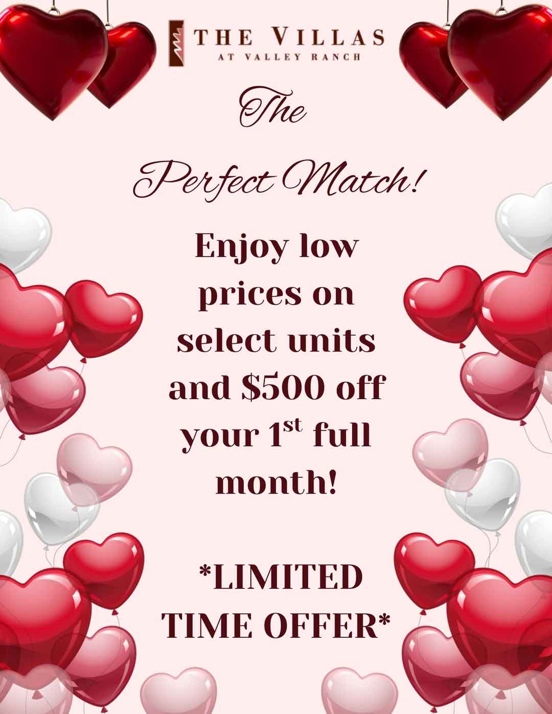 Superior customer service is our highest priority. Our friendly management team is here to assist you, and dependable maintenance staff is available 24/7. Don’t wait! Contact our leasing team today, and start your journey home to Villas at Valley Ranch.